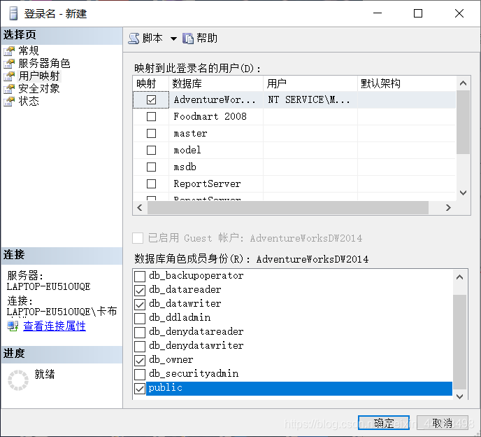 点击“用户映射”,选取映射的数据源(例如AdventureWorkDW2014),数据库角色成员身份再勾选“db_datareader”,“db_datawriter”,“public”。点击确定。